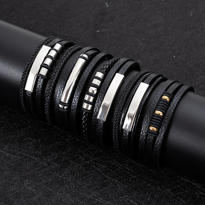 Europe and the United States cross-border fashion simple double leather rope woven bracelet men's gift lettering stainless steel vintage leather bracelet