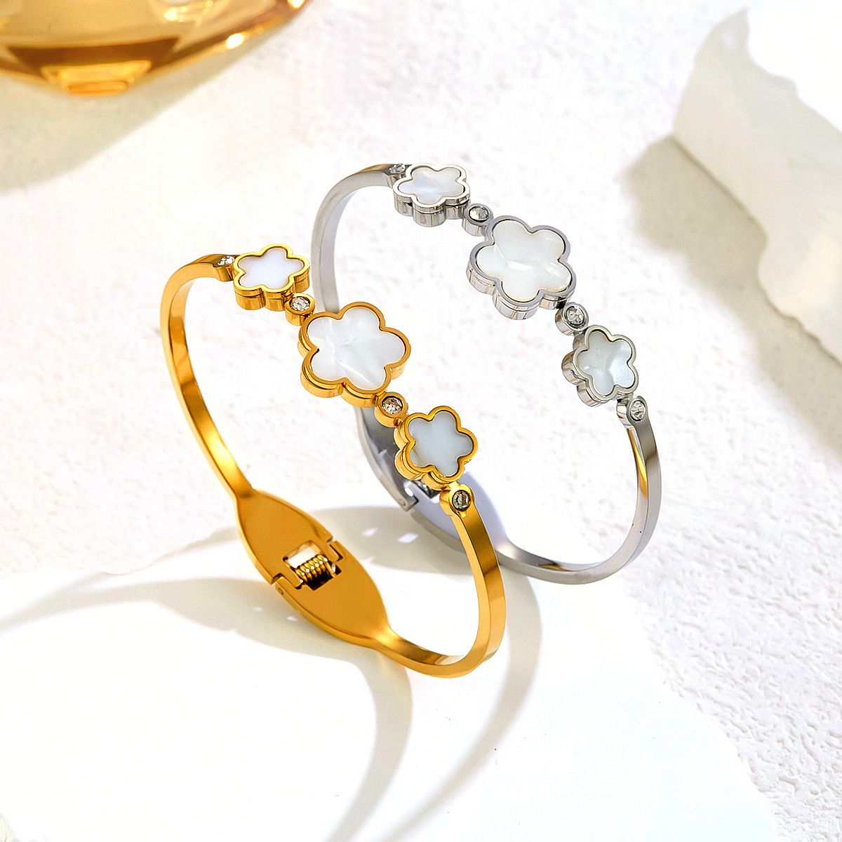 Korean Style Fashion Light Luxury White Shell Three-Leaf Clover Open Titanium Steel Bracelet for Women Versatile Non-Fading Jewelry Trendy