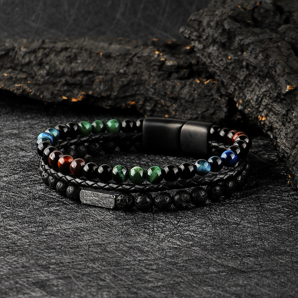 Cross-Border Hot Selling Men's Double Row Tiger Eye Stone Magnetic Buckle Braided Bracelet Natural Volcanic Stone Beaded Leather Rope Bracelet