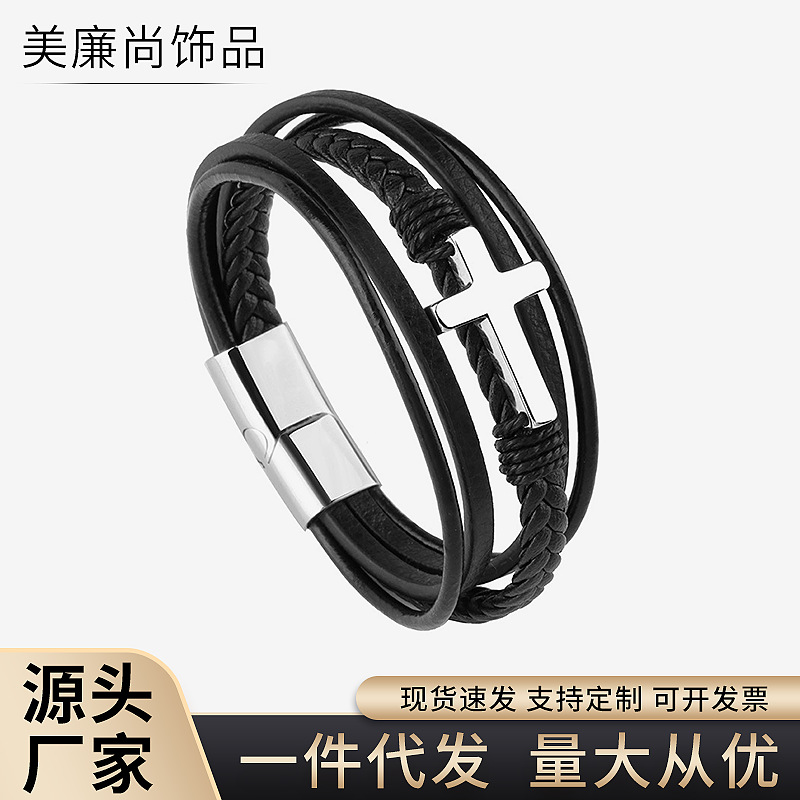 Amazon's Hottest Stainless Steel Leather Bracelet Men's Titanium Steel Cross Bracelet Personalized Leather Bracelet Woven Jewelry