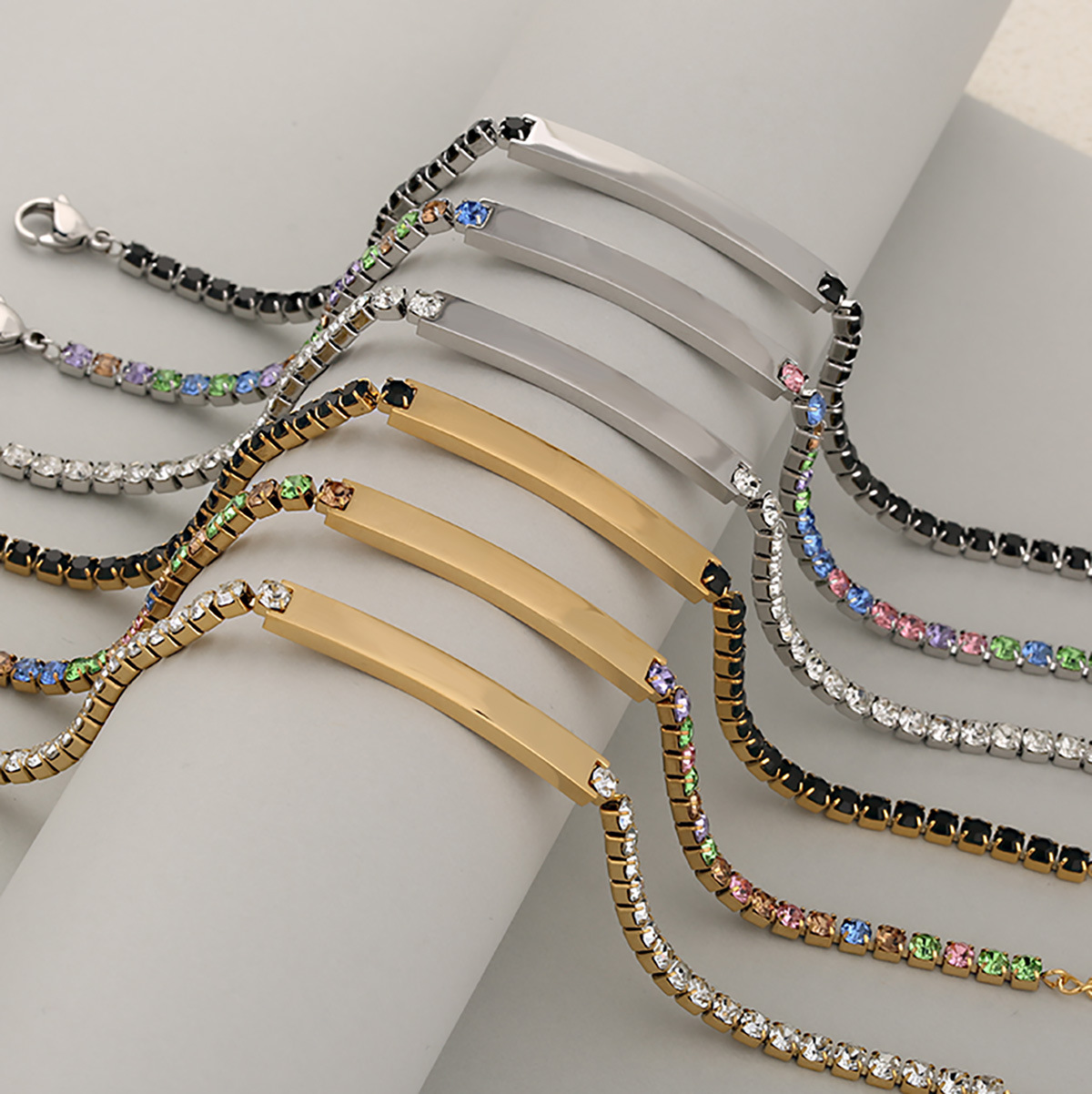 Cross-Border European and American Stainless Steel Fashion Tags Exquisite Glossy Long Curved Tags Color Diamond Design Bracelet Wholesale Jewelry