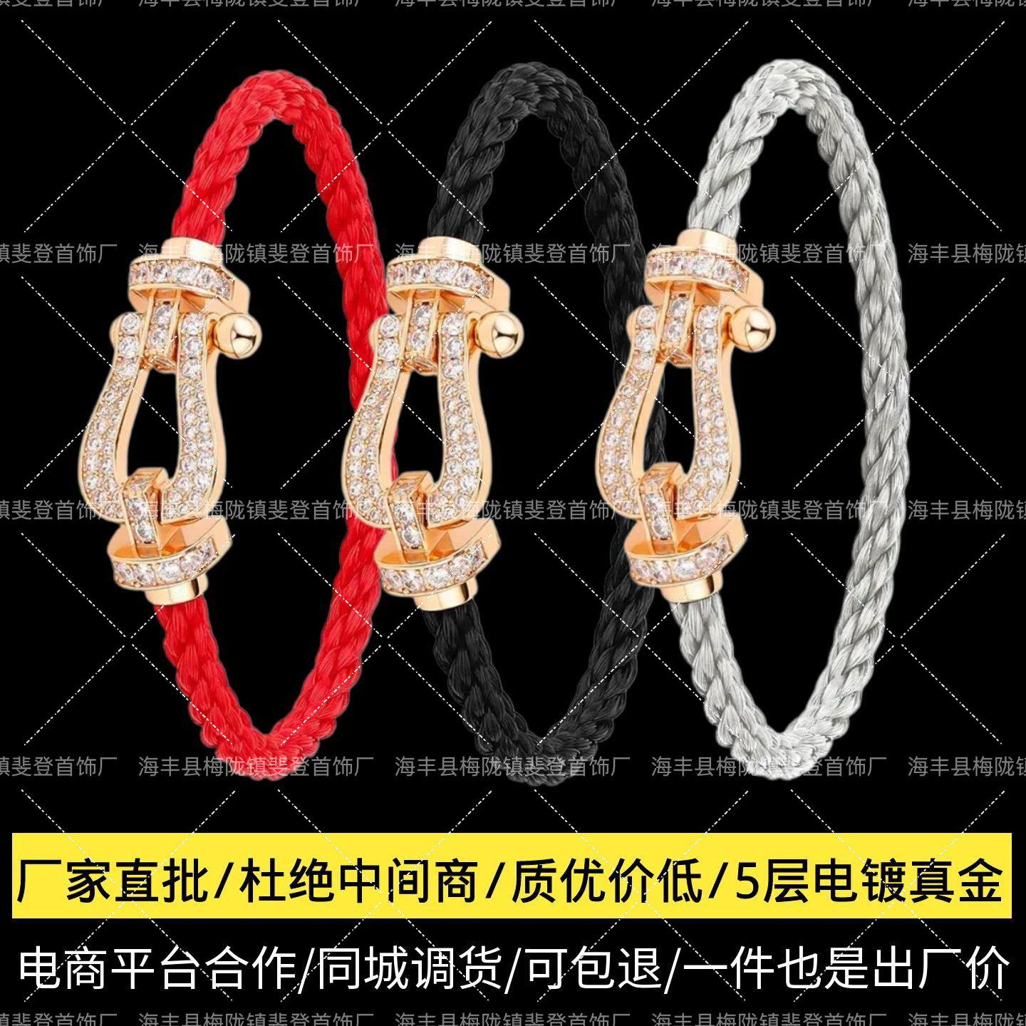 Real Manufacturer Fred Horseshoe Buckle Bracelet 18K Rose Gold Red Rope Steel Wire Full Diamond Bracelet Rope for Men and Women Couples