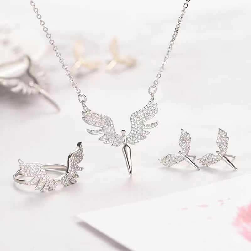 Thai Silver Guardian Angel Necklace Earrings Ring Design Niche ins Popular Jewelry Set Full Diamond Jewelry Wholesale