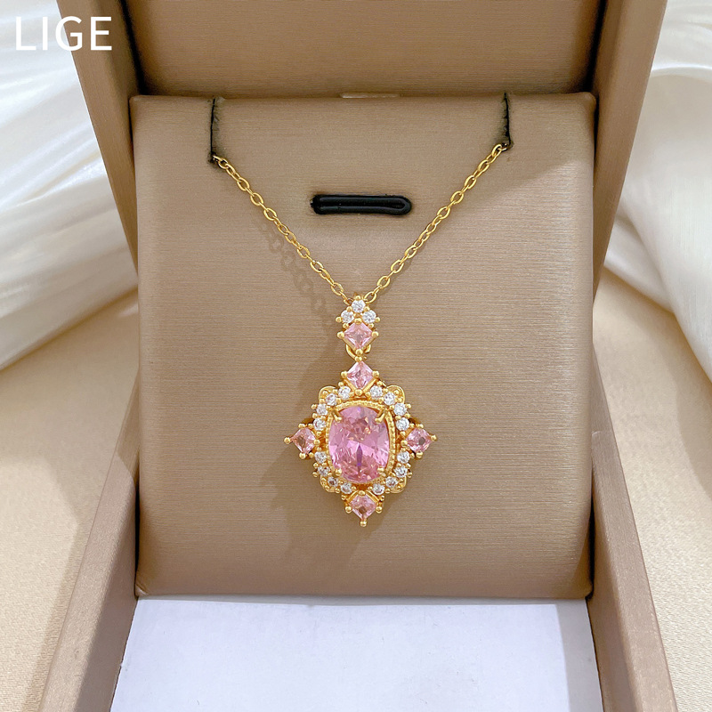 [Titanium Steel] Heavy Industry Pink Diamond Full Diamond Light Luxury Elegant Gorgeous Full Diamond Necklace Women's All-match Clavicle Chain Titanium Steel