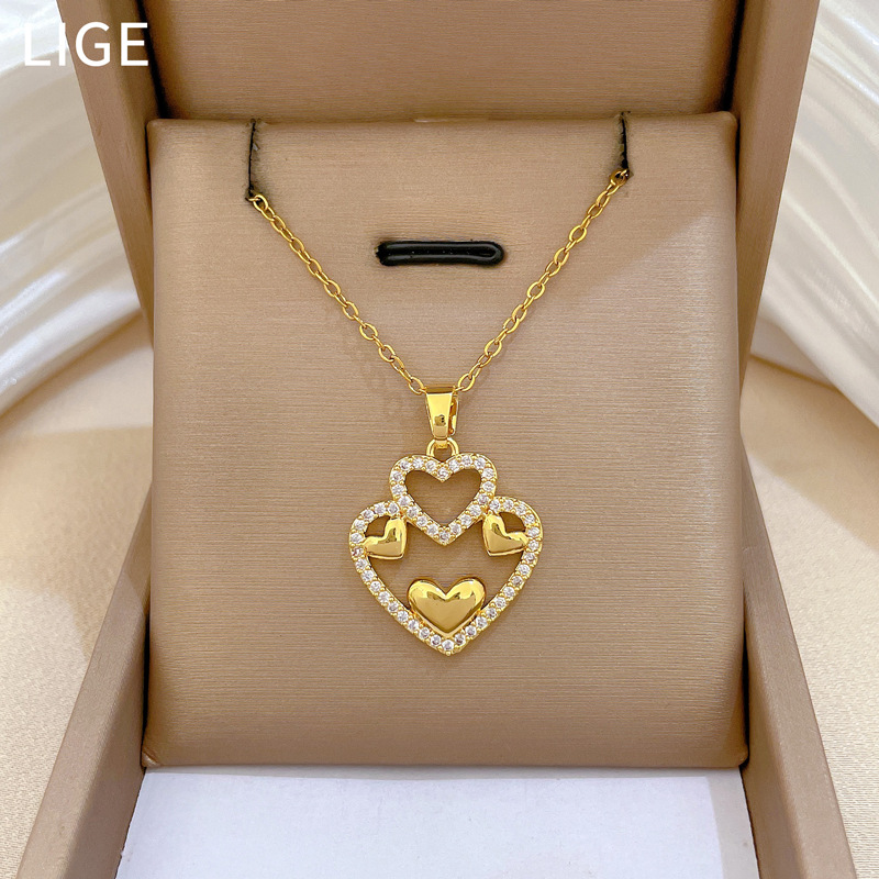 [Titanium Steel] Hollow Double-Layer Heart Accessible Luxury Elegant Gorgeous Full Diamond Necklace Women's Versatile Clavicle Chain Titanium Steel Chain