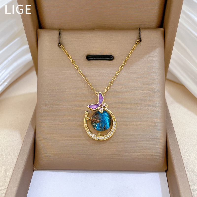 [Titanium Steel] Starry Sky Colorful Butterfly Light Luxury Luxurious Full Diamond Necklace Women's Easiest for Match Clavicle Chain Titanium Steel Chain