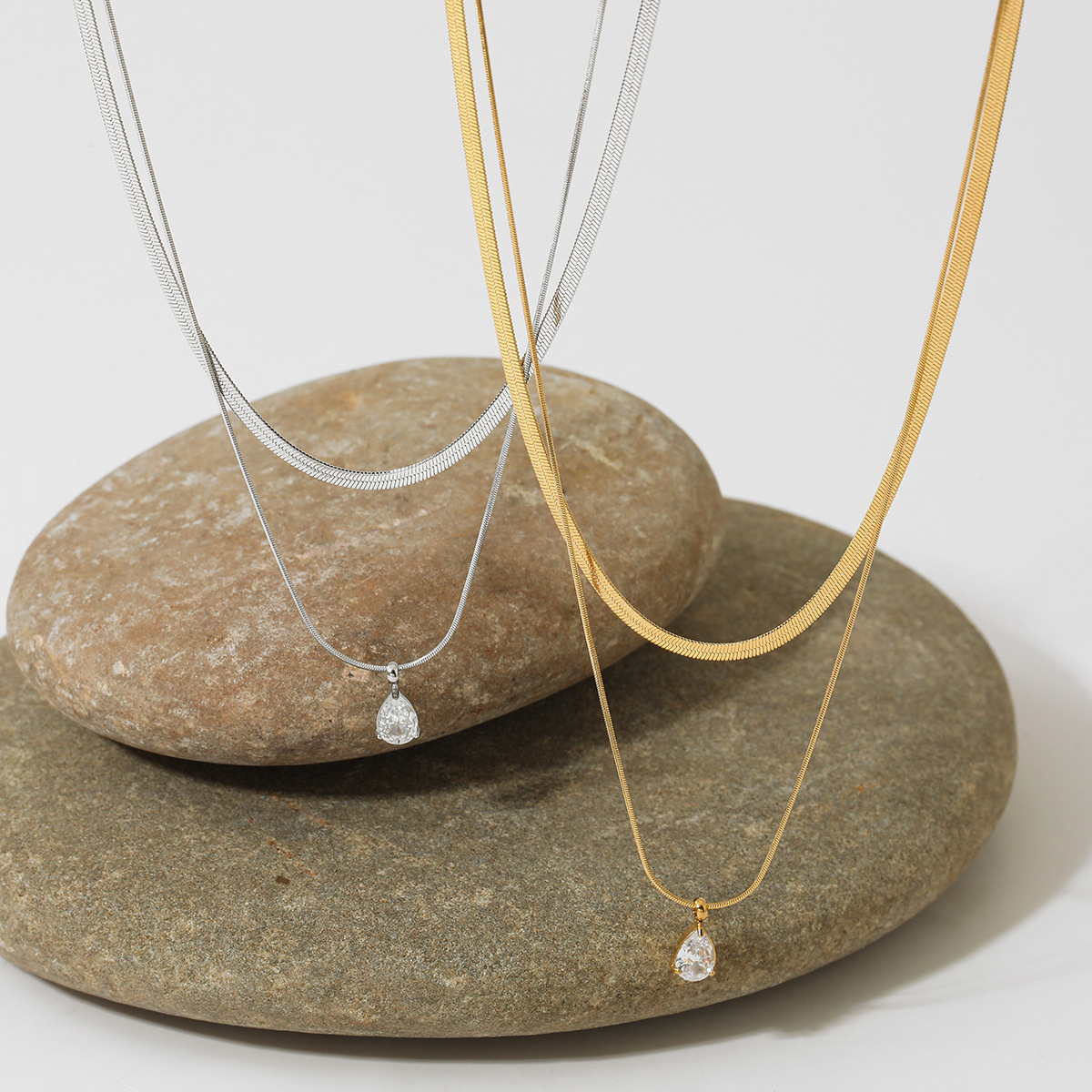 Cross-border new double-layer square snake chain water drop zircon necklace stainless steel design temperament Joker commuter jewelry batch