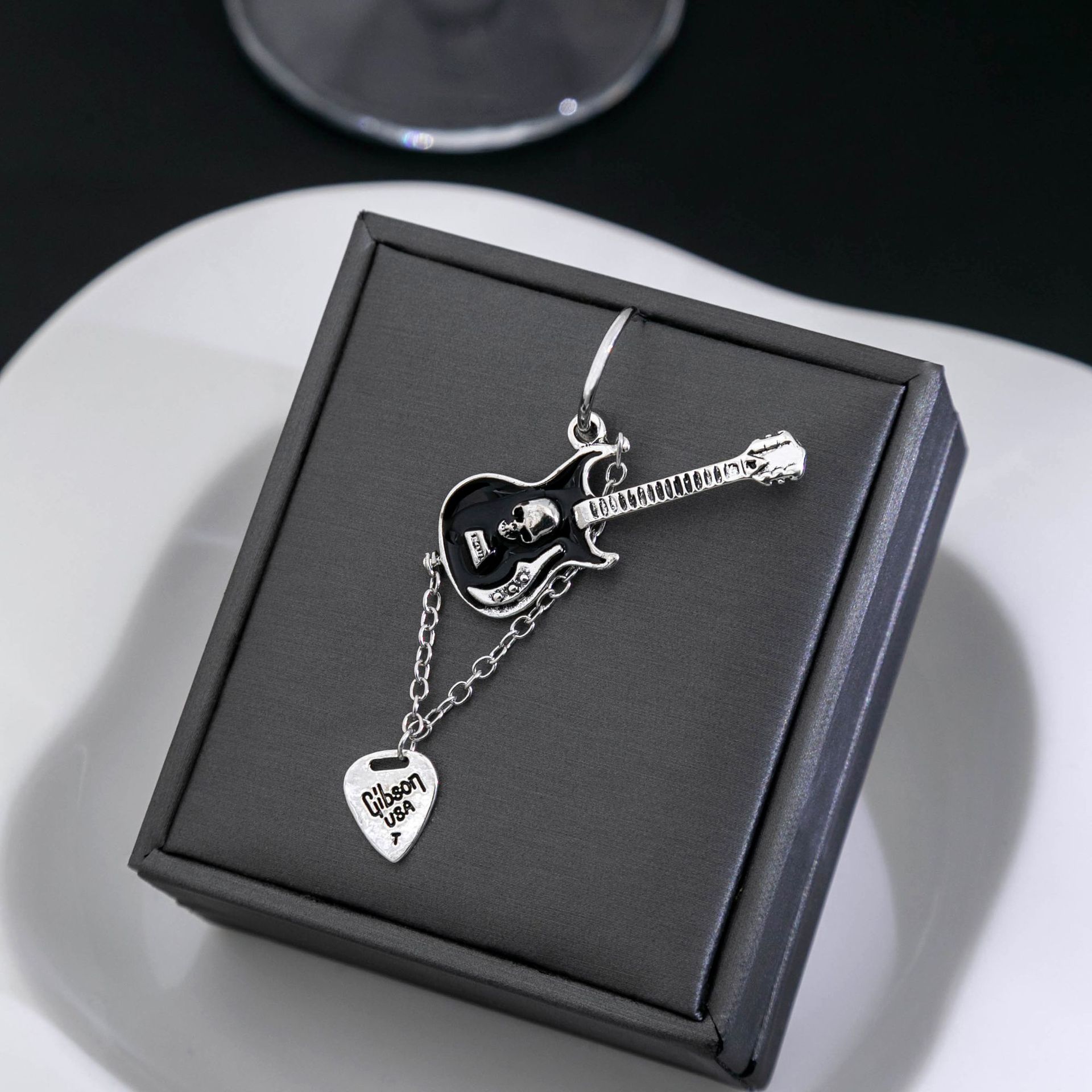 Silver Needle Personality Y2K Black Guitar Chain Earrings New Sweet Cool Peach Heart Pendant Earrings Advanced Sense Earrings