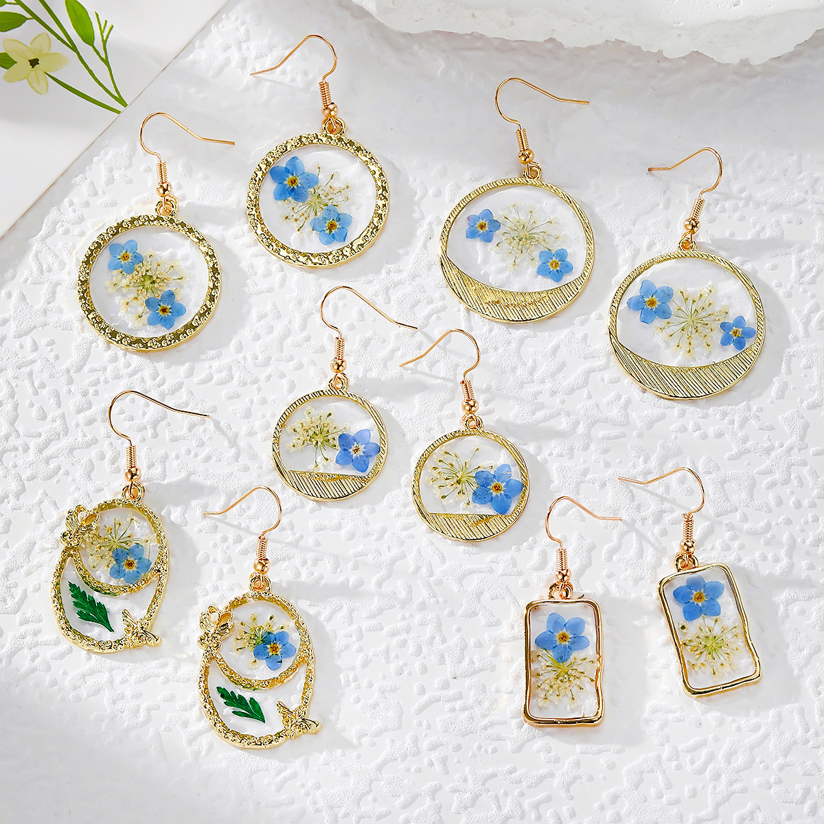 New Blue Series Eternal Dried Flower Stainless Steel Earrings Handmade Glue Forget-Me-Not Flower Earrings Jewelry Cross-Border