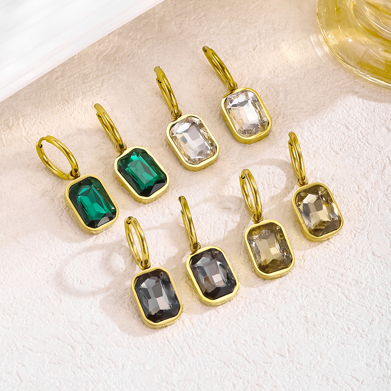 European and American Cross-border Hot Sale Emerald Rectangular Zircon Pendant Earrings Stainless Steel Gold Plated Simple Light Luxury Ear Ring Decoration