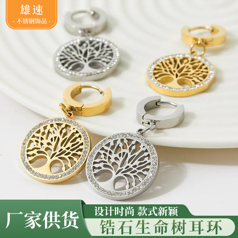 European and American Fashion Light Luxury Zircon Tree of Life Titanium Steel Earrings Retro Hollow Round Ear Hoops Stainless Steel Earrings Jewelry