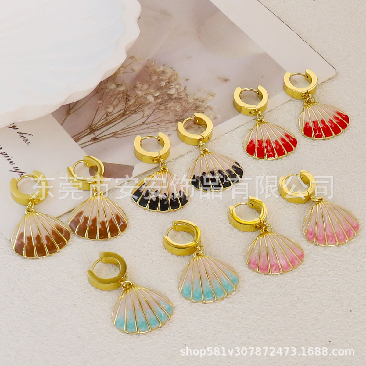 Cross-Border Fashion French Colorful Oil Drop Shell Earrings Stainless Steel Fan-Shaped Earrings Light Luxury High-End Jewelry Wholesale