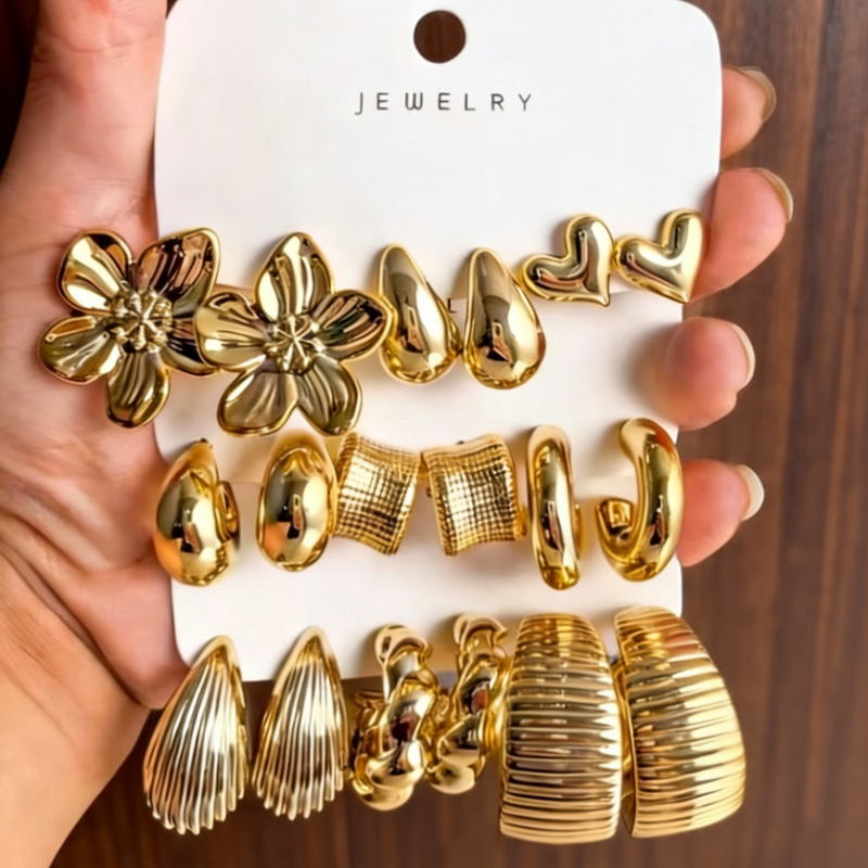 European and American Cross-Border Hot-Selling Jewelry Metal Geometric High-End Earrings Set Flower Heart C-Shaped Earrings Earrings