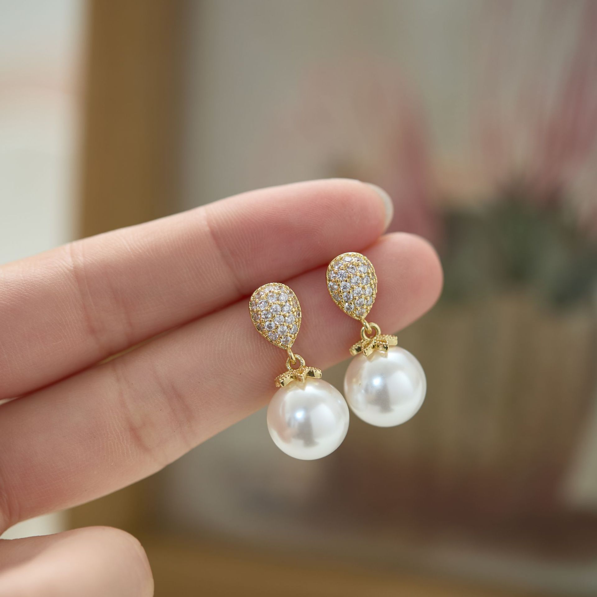 Tiktok-Style Water Drop Pearl Clip-On Earrings Without Piercings, Mosquito Coil Design, Copper Zircon Fashion Versatile Earrings, Light Luxury Earrings for Women