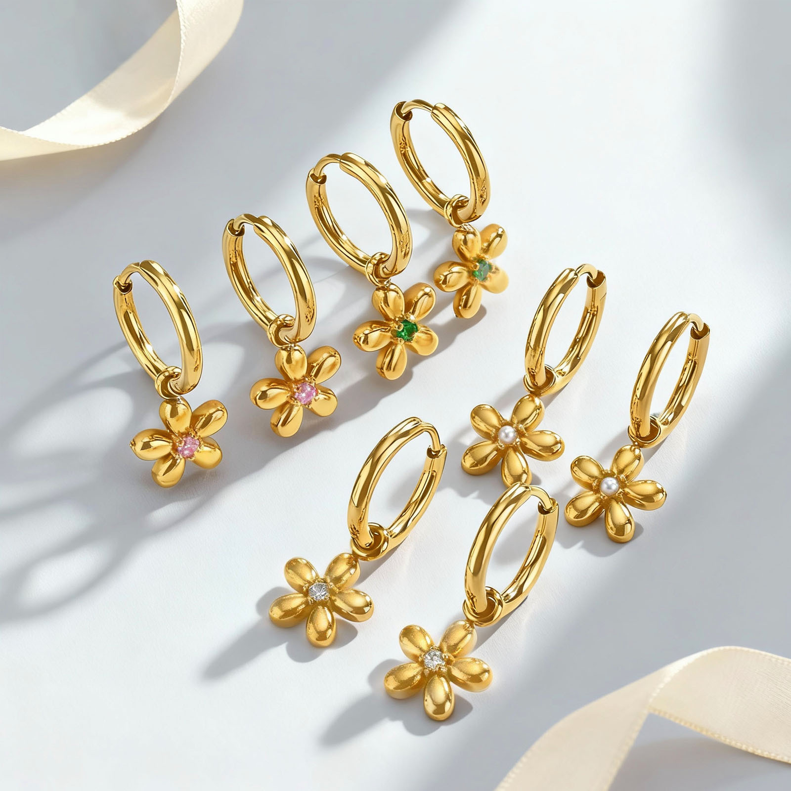 Women's Fashionable Stainless Steel Glossy Flower Earrings Imitation Pearl Earrings Gold Pink Green Zircon Earrings