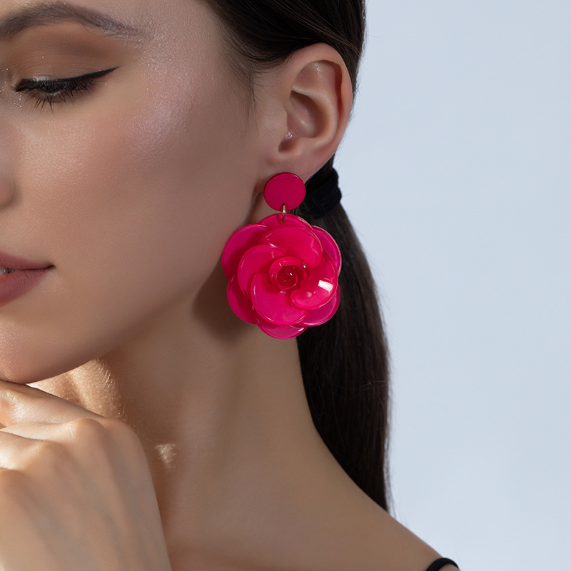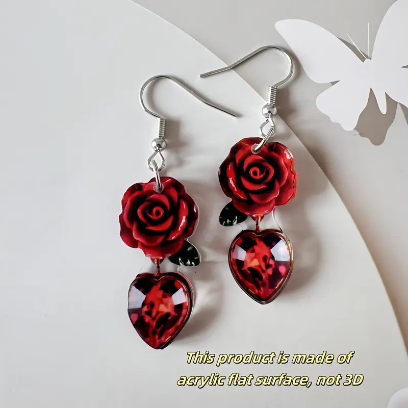Cross-Border New Style Bohemian Red Rose and Heart-Shaped Flat Acrylic Earrings, Elegant and Personalized Red Rose Earrings