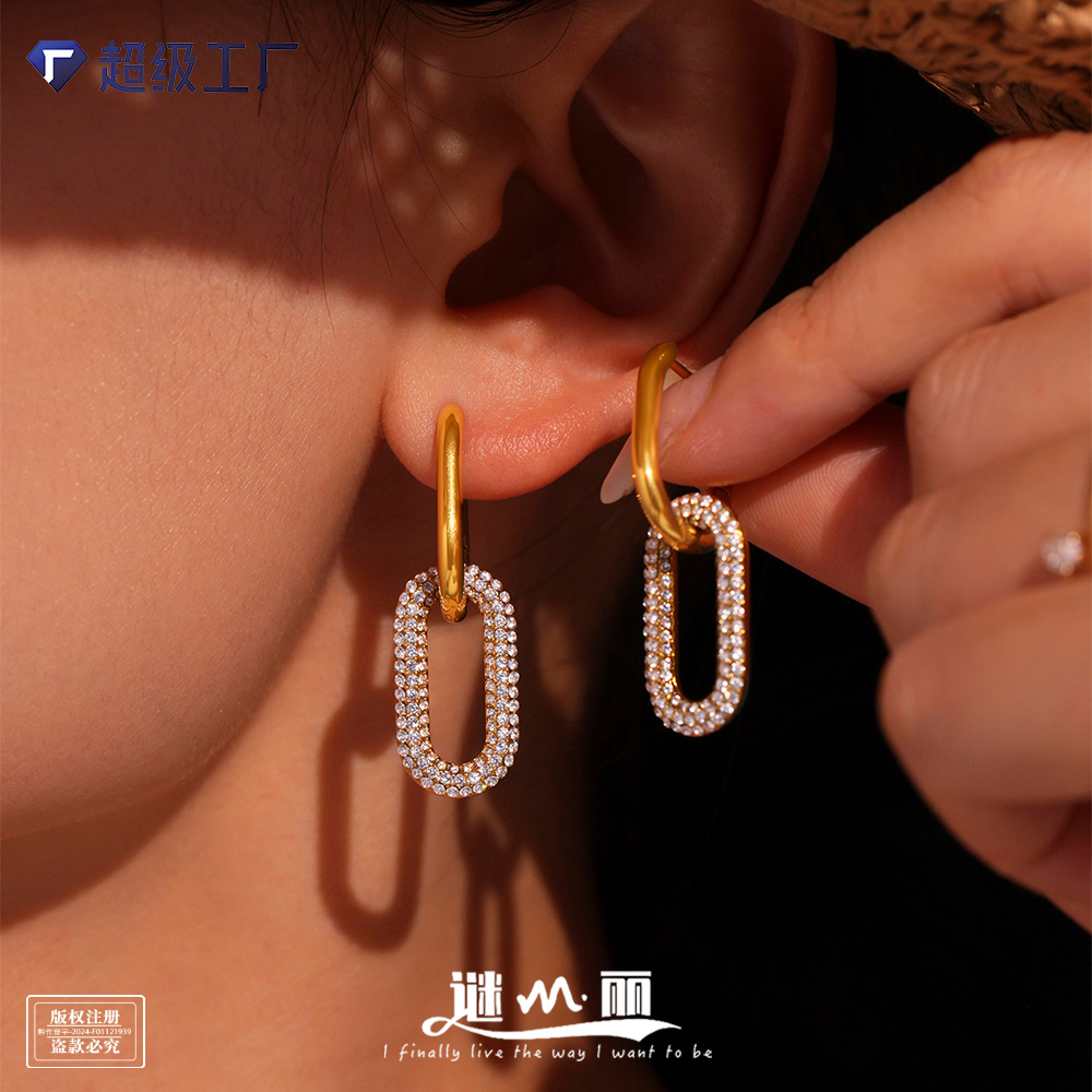 Enigma 304 Stainless Steel Zircon Oval Double Ring Ear Buckle European and American Fashion Personality Full Diamond Earrings Stainless Steel Earrings