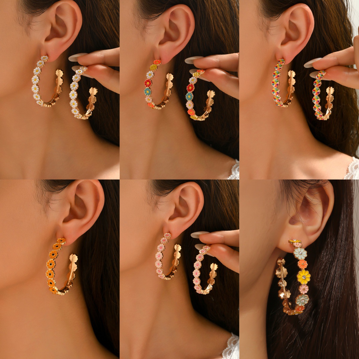 Temu Cross-Border Hot-Selling Simple Elegant Colorfulful Oil Drop Daisy C-Shaped Earrings Niche Accessible Luxury Earrings for Women