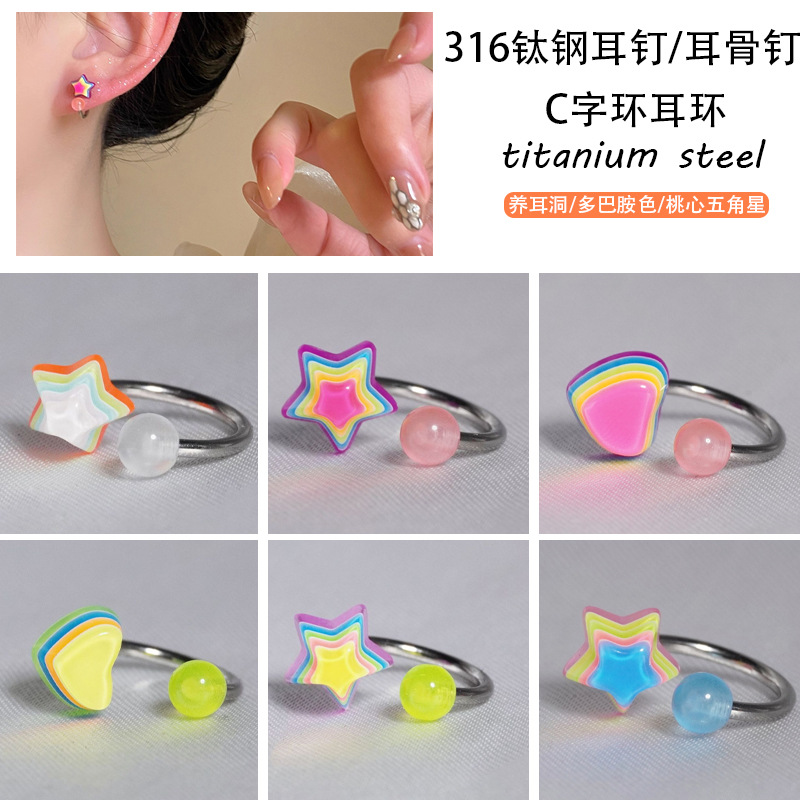 Cross-Border Stainless Steel Earrings C-Shaped Ring Candy Color Luminous Ball Peach Heart Five-Pointed Star Lip Ring Fashion Piercing Jewelry
