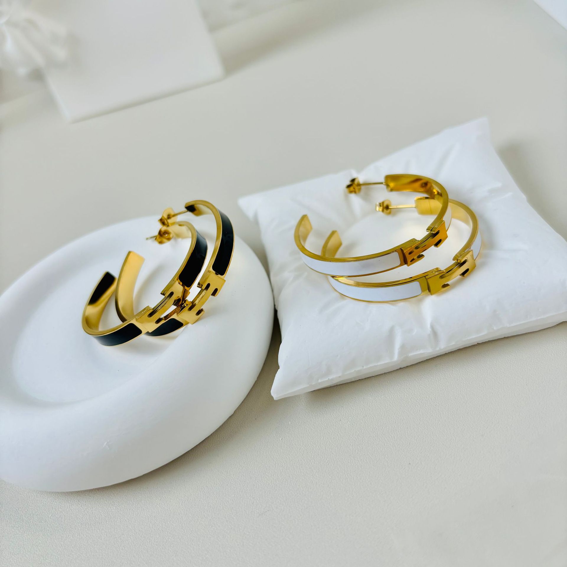 Large Circle New Stainless Steel Oil Dropping H Earrings Black and White Ear Ring Waterproof No Falling Ear Needle Letter Paint Ear Ring