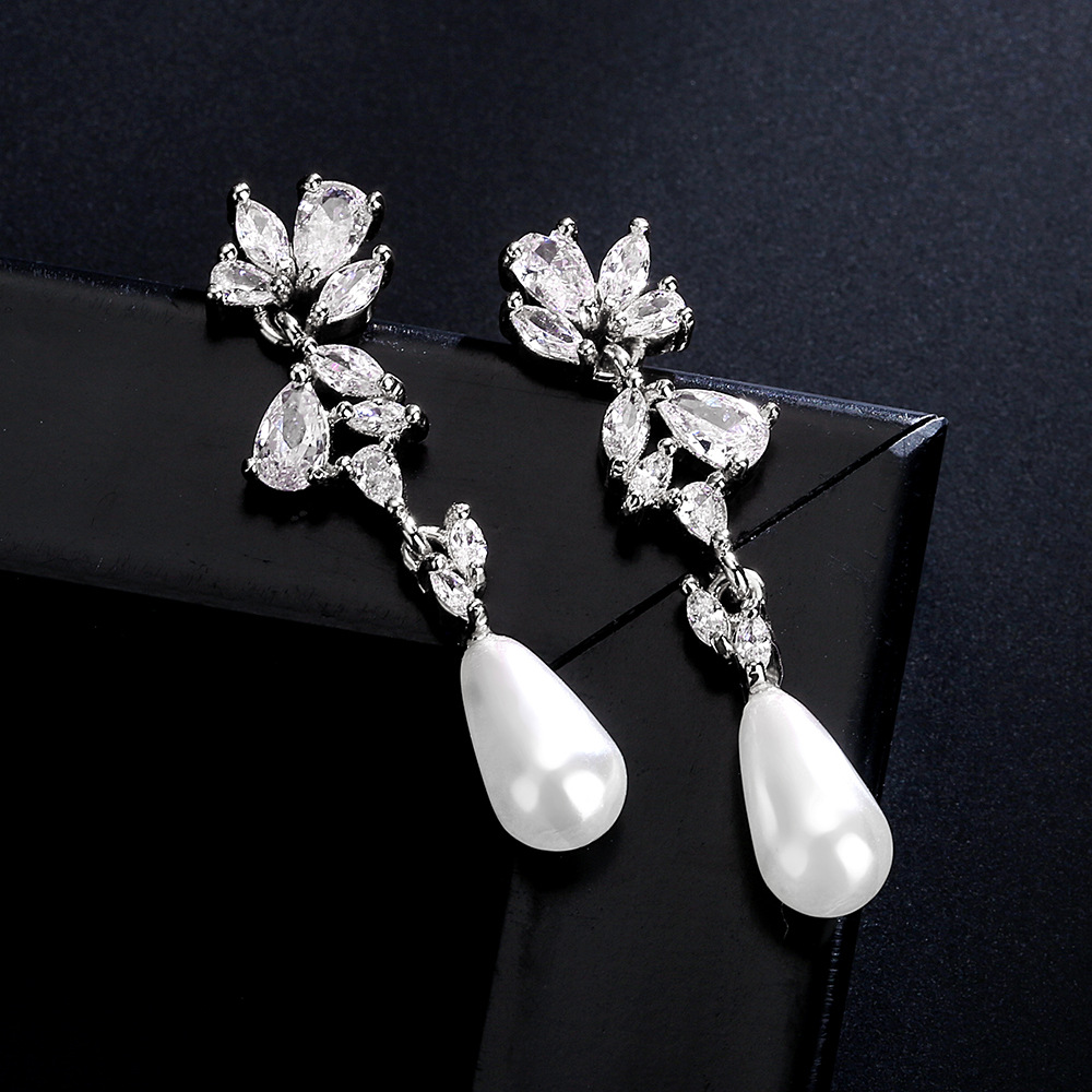 RAKOL European and American Elegant Long Ice Flower Zircon Earrings Female Super Fairy Design Pearl Earrings Bridal Earrings
