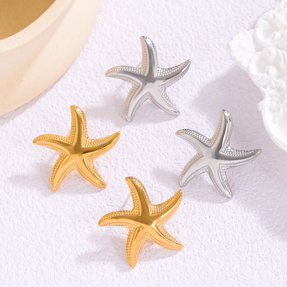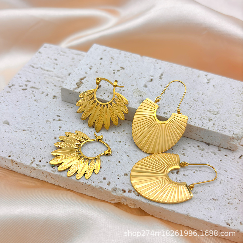 Cross-border European and American ins Style Shell-shaped Stainless Steel Earrings Women's 18K Gold Plated Feather Ear Buckle Radioactive Texture