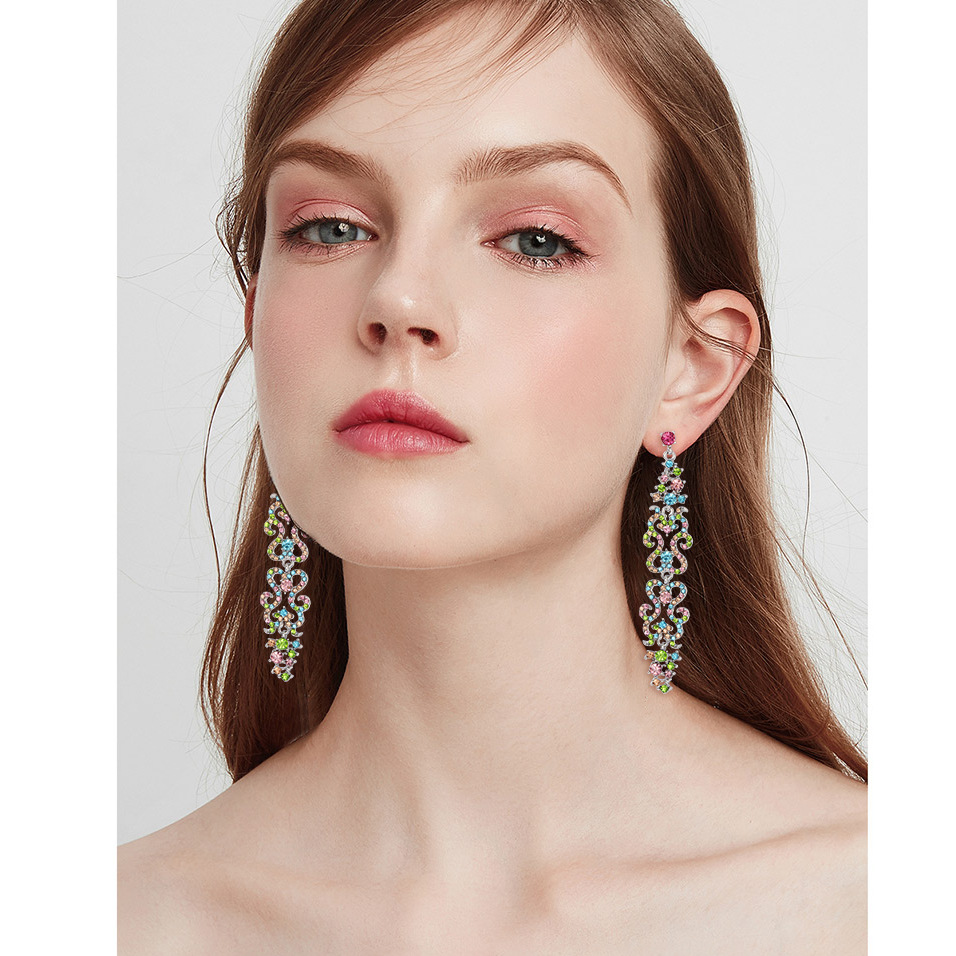 Cross-border luxury elegant full diamond earrings colorful flower long earrings European and American fashionable exaggerated wedding dinner earrings