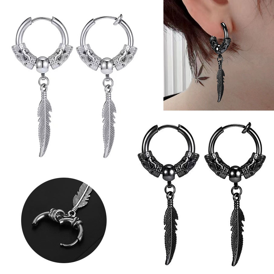 Korean Style Fashionable Men's Retro Xizang Dragon Earrings Feather Pendant Ear Buckle Ear Clip Perforated Earrings