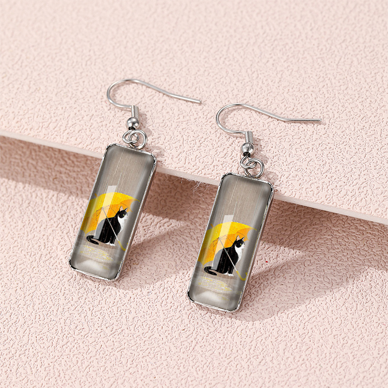 Cross-Border 2023 Umbrella Couple Cat Comic Style Time Gem Square Earrings Earrings Stainless Steel Ear Hook Earrings