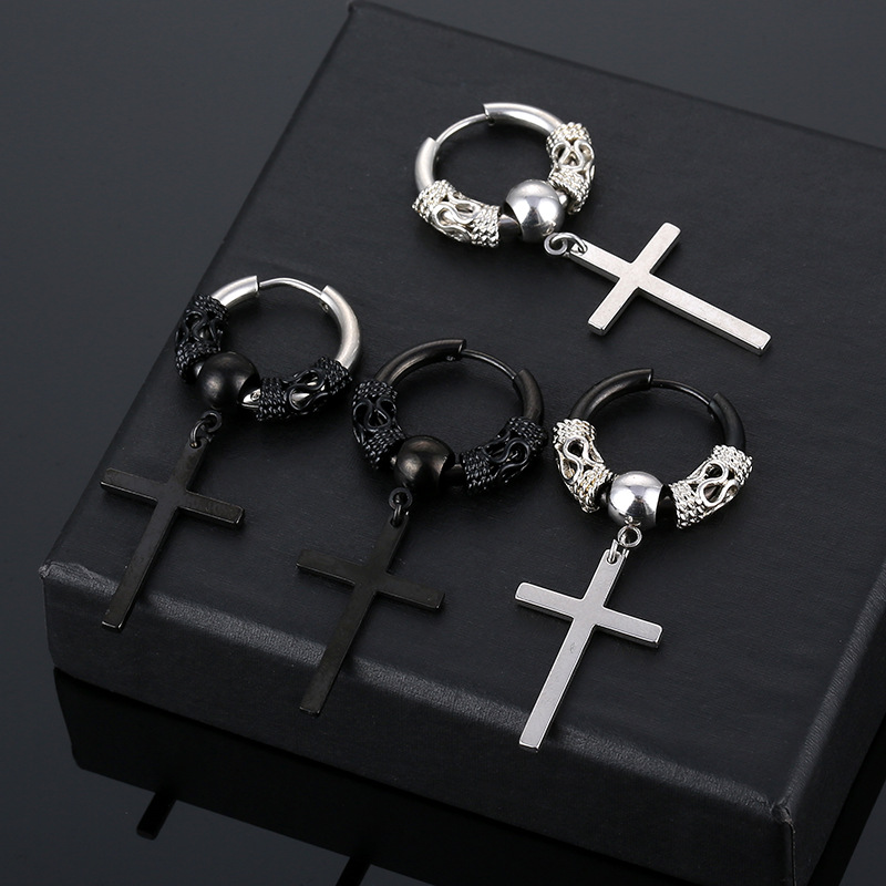 Retro Xizang dragon pattern stainless steel round wire earrings cross titanium steel ear bone buckle hip hop men's and women's ear ring ear jewelry