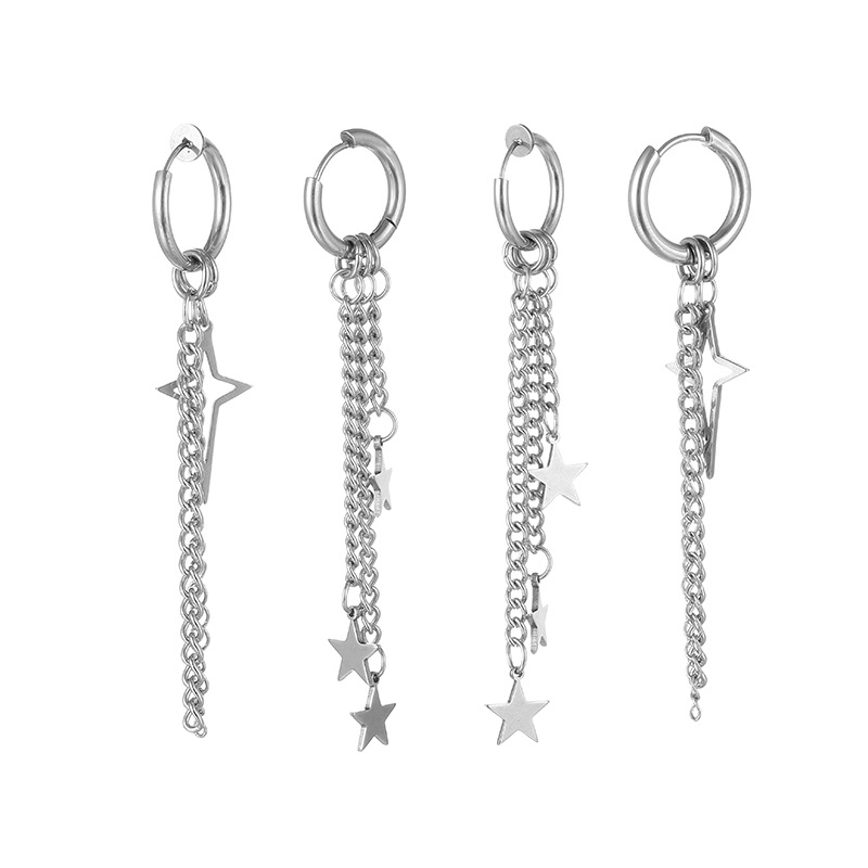 Cross-border Korean Tassel Chain Four Mans Star Stainless Steel Circle Earrings Titanium Steel Ear Buckle Men's Hip-hop Earrings Earrings