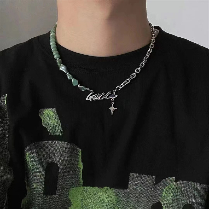 Japanese and Korean Style Emerald Stone Stitching Stainless Steel Chain Necklace Men and Women Simple Titanium Steel Necklace Personalized Sweater Chain