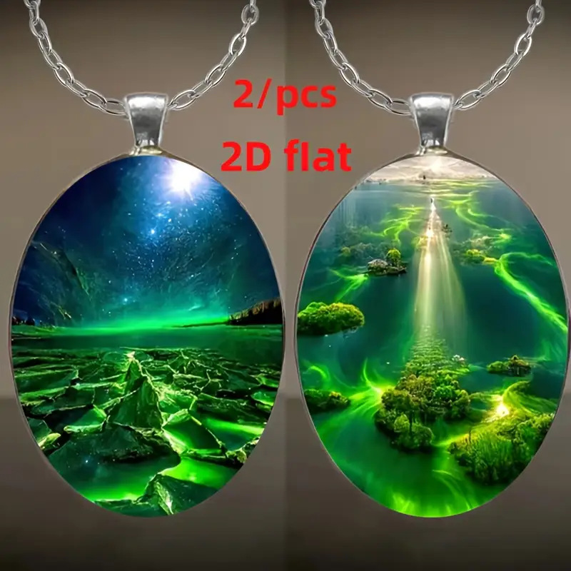 Elegant Green Aurora Natural Scenery Pattern Oval Glass Alloy Pendant and Stainless Steel Chain Necklace