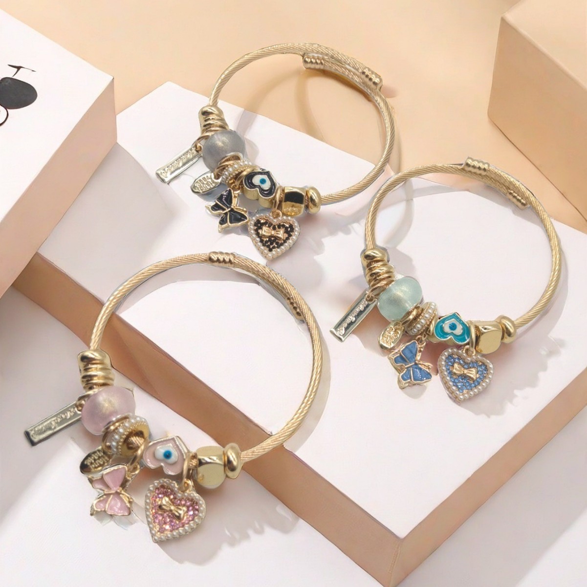 Cross-Border Retro Gold Stainless Steel Bracelet for Women Trendy Fashion Rhinestone Heart Butterfly Pendant Bracelet Rose Gold