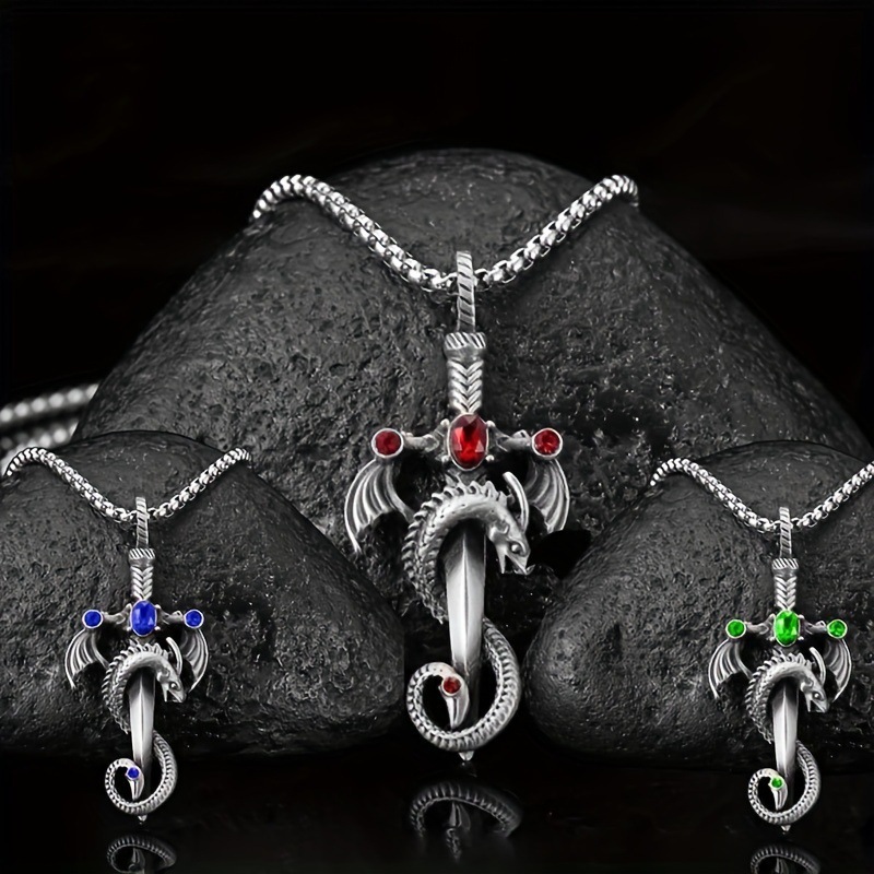 Foreign trade hot multi-color gem dragon sword stainless steel chain necklace men retro punk gothic jewelry wholesale generation