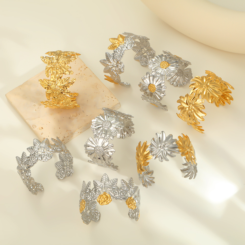 European and American Bohemian Style Titanium Steel Bracelet Daisy Flower Shape Wide Version Accessible Luxury Open Stainless Steel Bracelet Gold