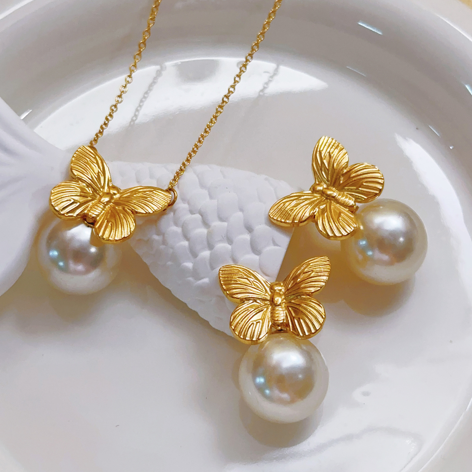 Cross-Border New Light Luxury Bow Pearl Necklace Niche Unique Wings Flowers Stainless Steel Earrings Jewelry Wholesale
