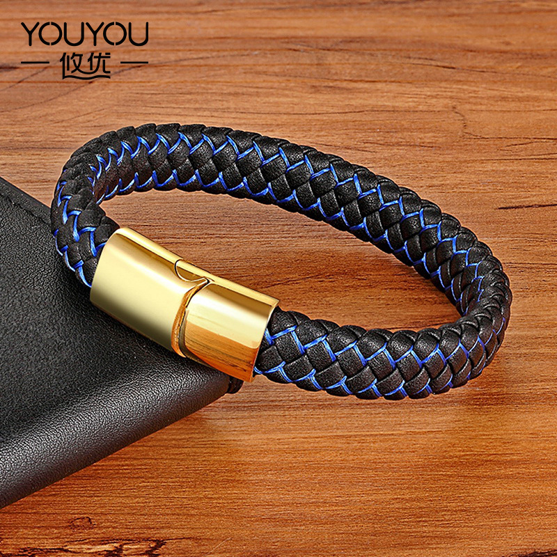 Titanium steel chain woven leather bracelet stainless steel magnet buckle leather bracelet fashion punk jewelry bracelet