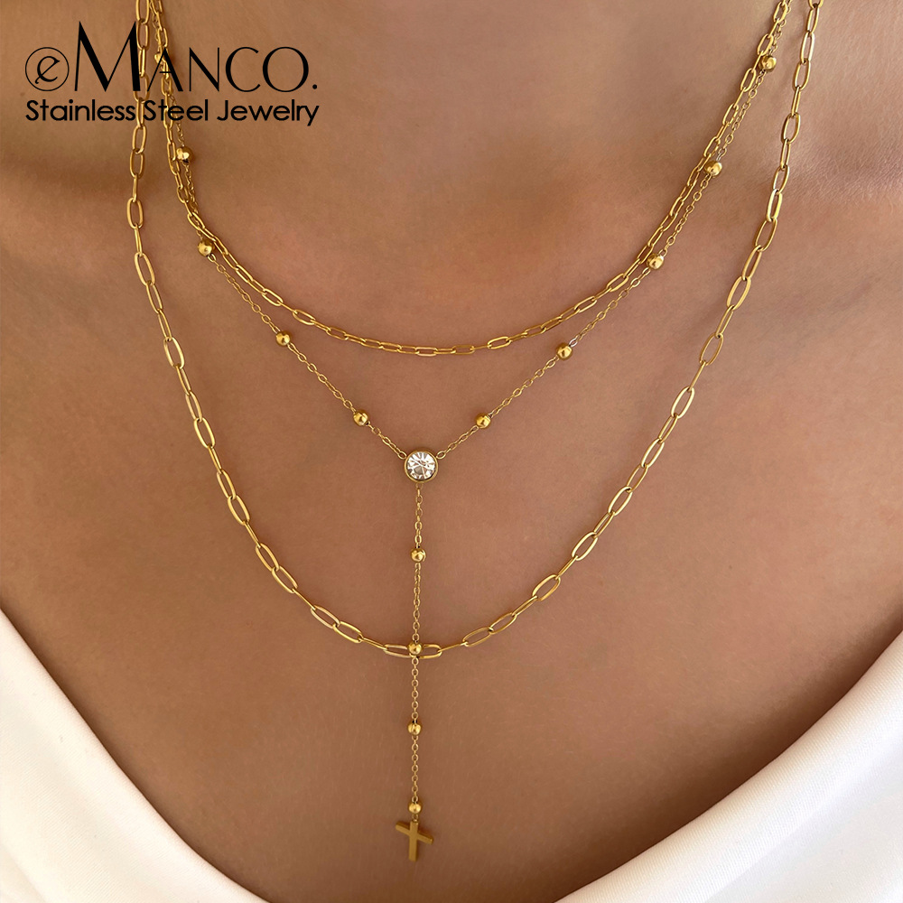 EManco Stacked Necklace with Jewelry Long Cross Stainless Steel Collarbone Bead Chain Sexy Necklace Jewelry for Women