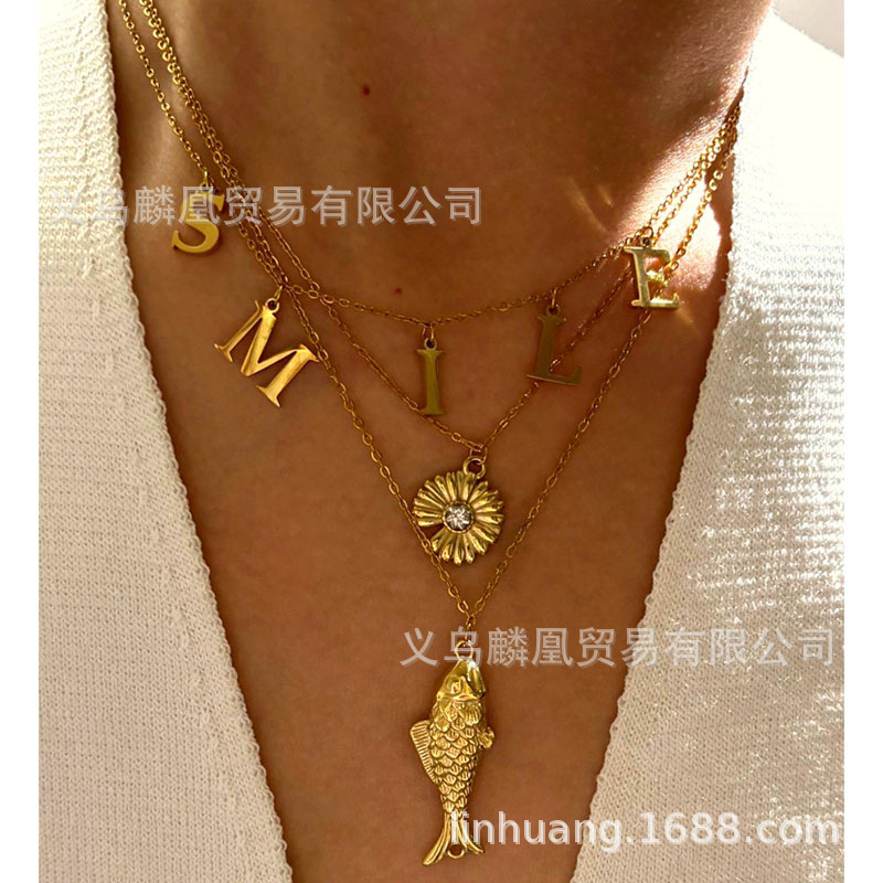 European and American Fashion High-End Stainless Steel Letter Small Fish Sunflower Women's Stacking Necklace Personalized Women's Clavicle Chain