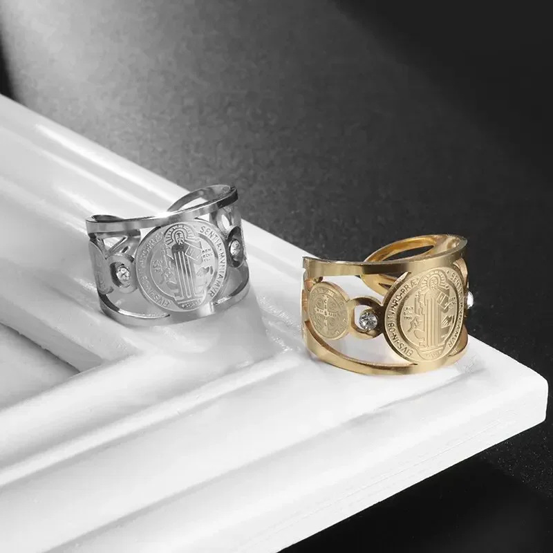 European and American Versatile Stainless Steel Saint Benedict Exorcism Brand Titanium Steel Men's Open Ring High-End Fashion Ring Wholesale