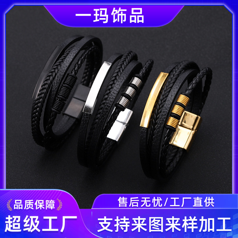 Europe and the United States cross-border new stainless steel leather rope bracelet laser lettering three-layer woven men's multi-layer leather bracelet