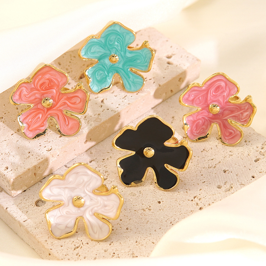Temu Hot-Selling Oil-Dropping Flower Ring Holiday Style Personalized Versatile Stainless Steel Flower Ring Hand Jewelry Drop Shipping