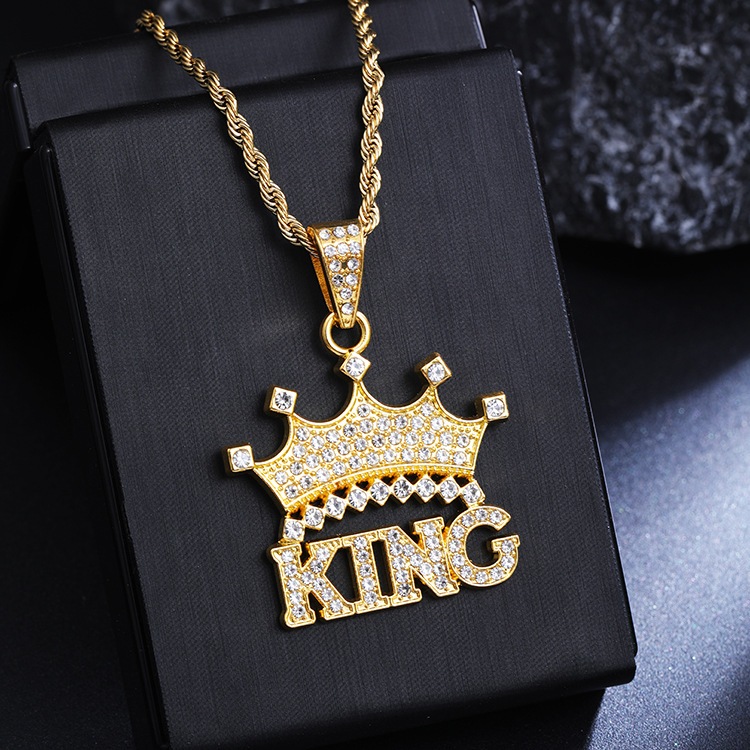 European and American Style Crown Letter King Full Diamond Pendant Necklace for Men and Women Trendy Hip-Hop Cross-Border Jewelry Manufacturer Wholesale