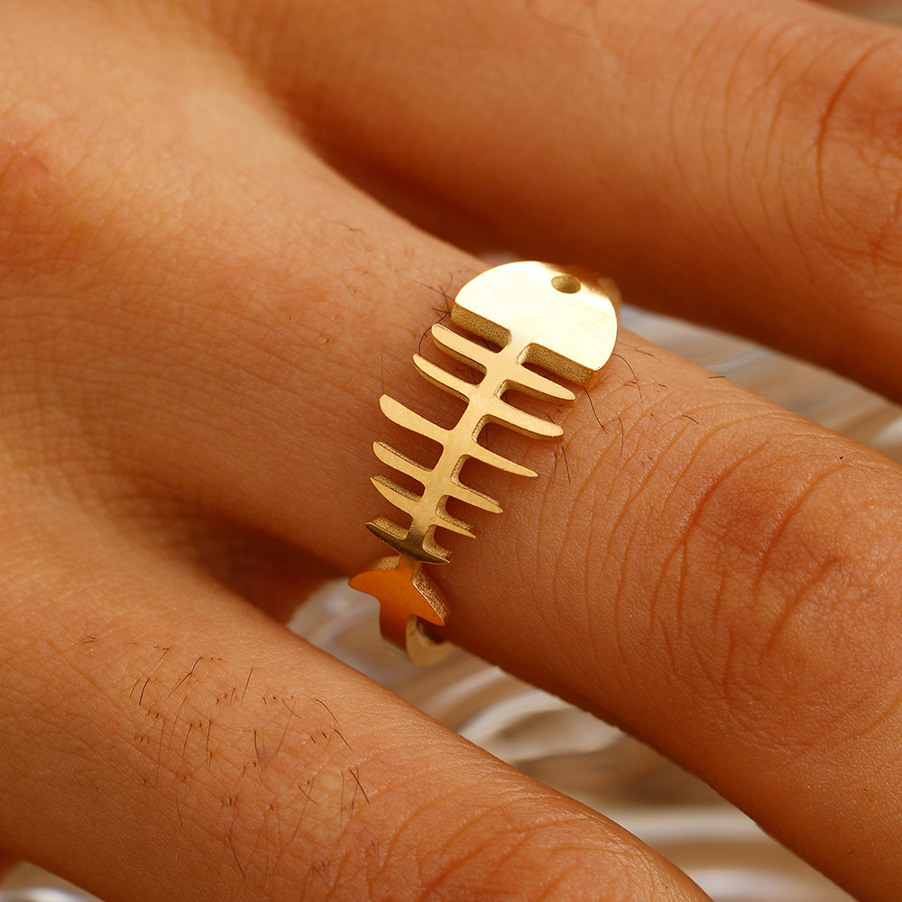 Stainless Steel Plated 18K Gold Fish Bone Opening Adjustable Ring for Women Popular Stylish Cute Retro Finger Jewelry