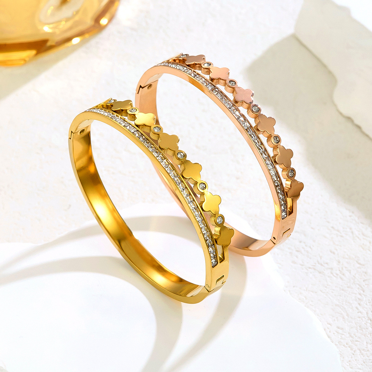 Cross-Border New Titanium Steel Diamond-Encrusted Four-Leaf Clover Bracelet Vacuum Electroplated Double-Layer Four-Leaf Flower Bracelet Simple Light Luxury Bracelet