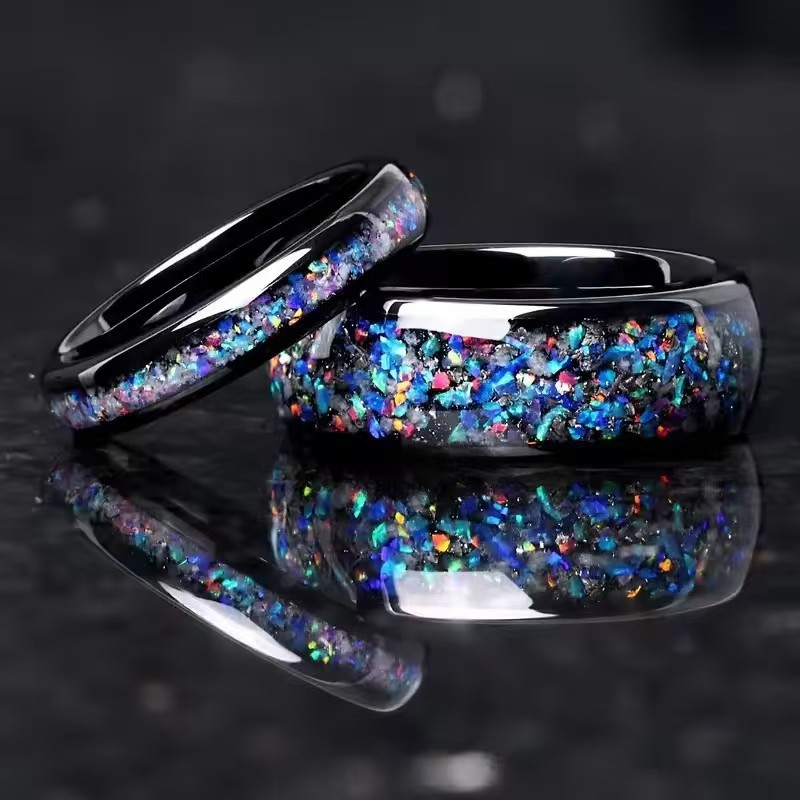 Black Wedding Ring, Night Dream Glow, Stainless Steel Luminous Floral Engagement Ring for Men and Women, Spherical Dark Blue Floral Pattern
