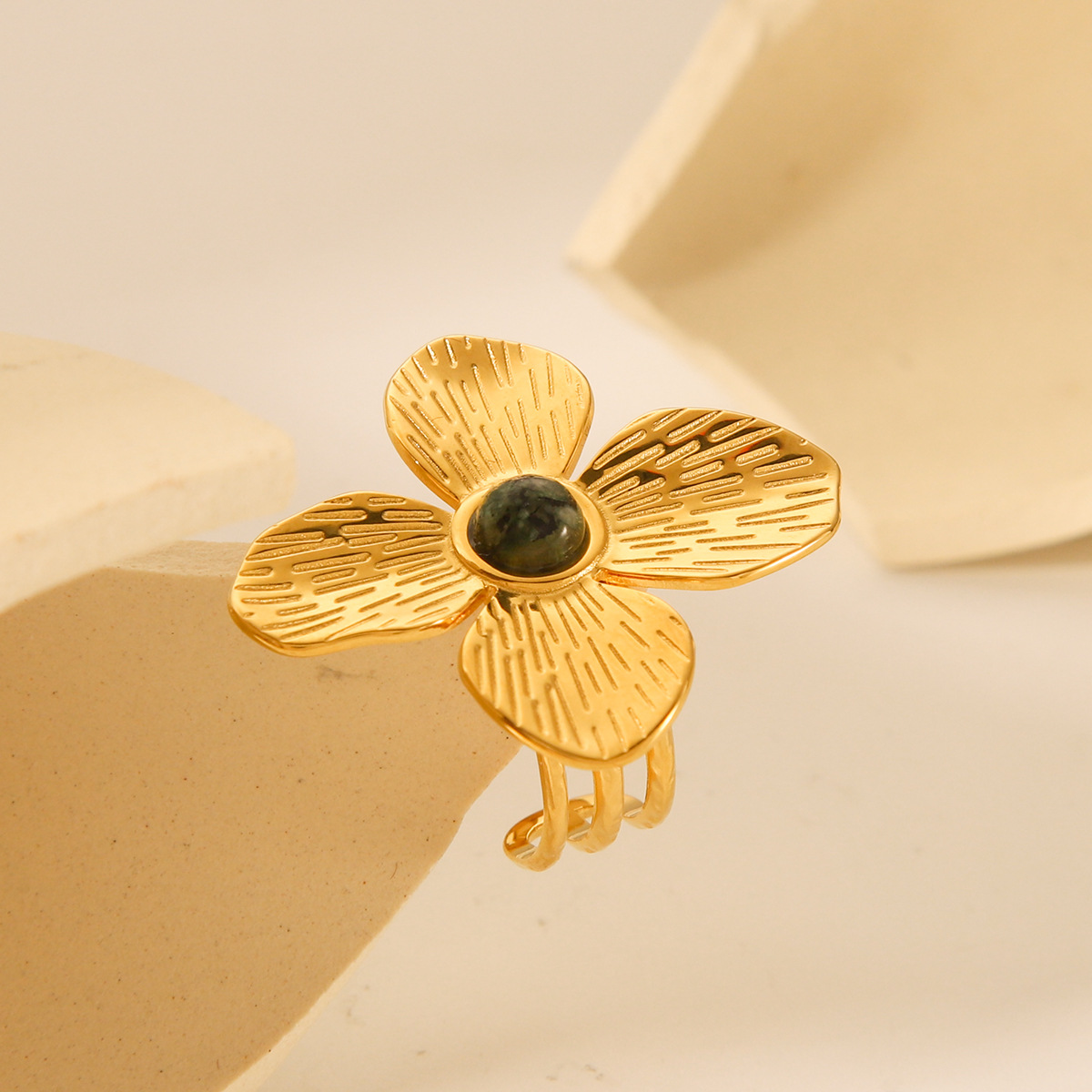 French retro style four-petal flower stainless steel inlaid African turquoise open ring female temperament high-grade ring