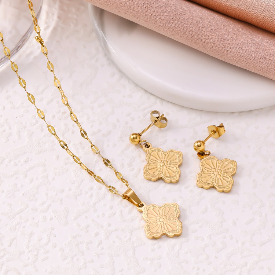 Trendy New Vacuum 18K Gold Stainless Steel Carved Four-Leaf Clover Necklace and Earrings Set for Women Exquisite Jewelry