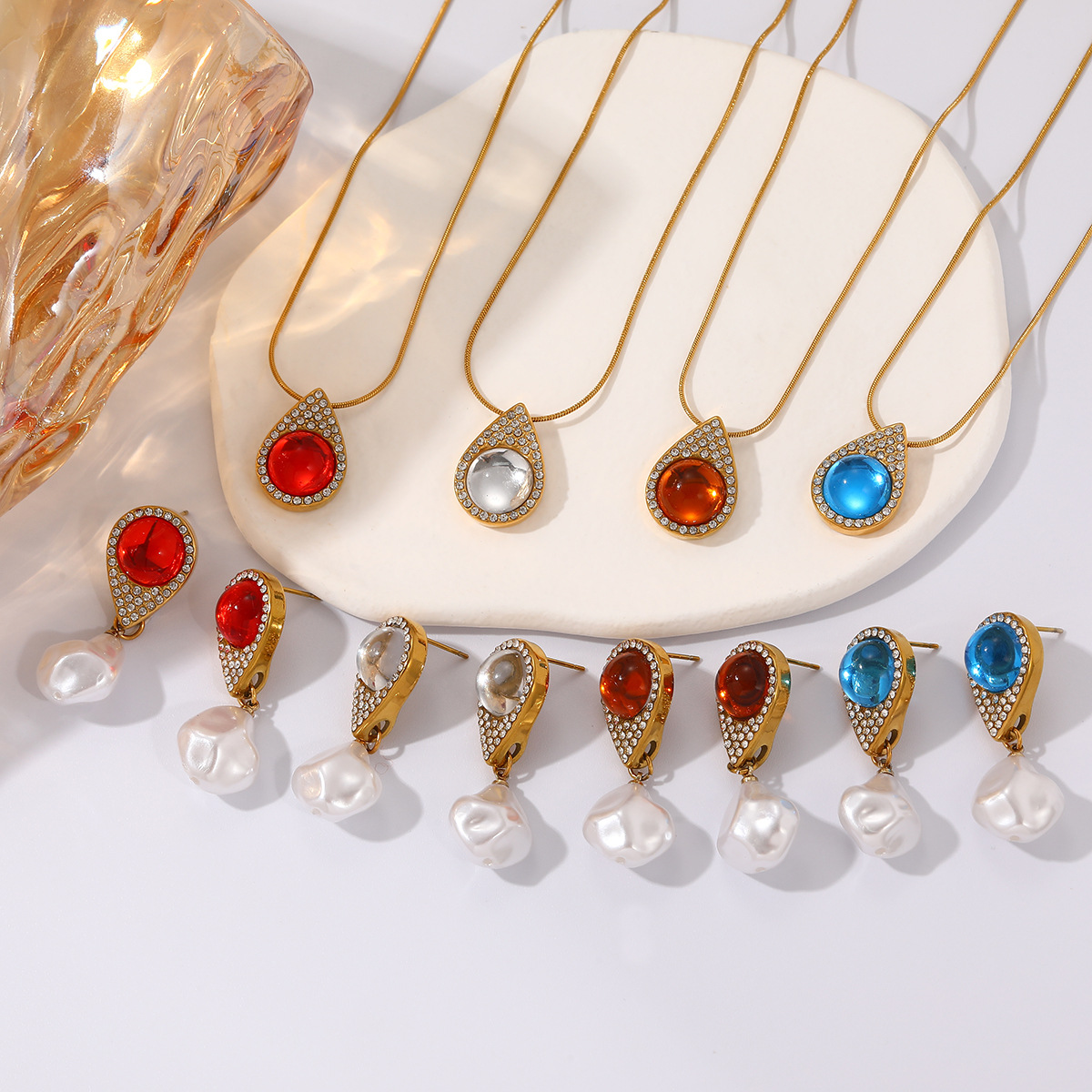 French Light Luxury Style Stainless Steel Jewelry Set for Women, Retro Palace Style Drop-Shaped Earrings, Necklaces, High-End Jewelry